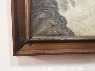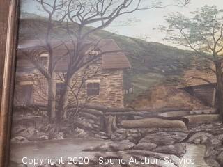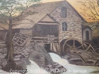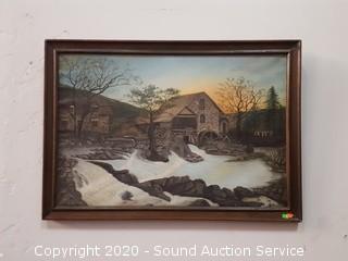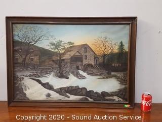 Lot #0034: Original Vtg. Waterwheel Mill Oil Painting
