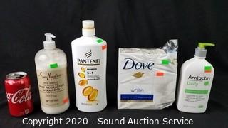 Item Description: Includes 9 bars of Dove White moisturizing soap, 20oz Amlactin moisturizing body lotion, 34oz Shea Moisture coconut oil daily hydration shampoo and 38.2oz Pantene Pro V