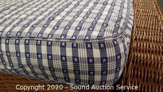 Item Description: Blue plaid cushioned fabric, see a couple small breaks in the wicker otherwise in excellent condition. 35" H x 33" W x 61".