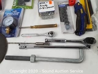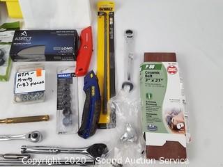 Description Cont. 1: 3x21" ceramic sanding belt, Irwin utility knife, Craftsman 25ft tape, ratchets 3/8" and 1/4" drive, Kobalt depth stop set, DeWalt 5/16" x 12" drill bit and more.