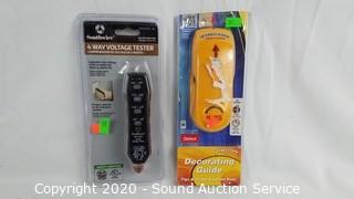 Item Description: Includes Craftsman 8" carpenters square with built in level (corner is broken), HD25 stud sensor, 4-Way Voltage Tester and folding grab tool.