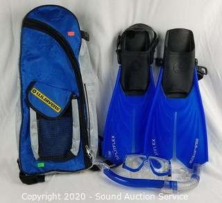 Item Description: Pair of fins size 10-13, one snorkel, one pair of goggles and carrying pack.
