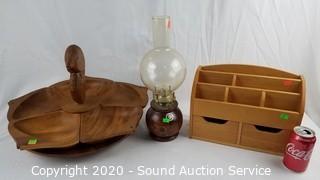 Item Description: Also comes with a desktop organizer. Oil lamp has a wooden base, by Lamplight Farms. Lazy Susan has a fish centerpiece and 5 fish shaped bowls, 19" diameter.