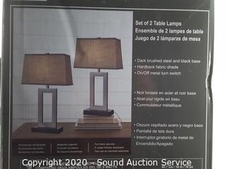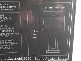 Item Description: Dark steel and black base with hard fabric shade. Box was sealed, opened to verify contents. Box has some damage, otherwise brand new.