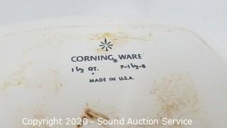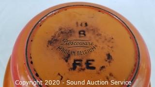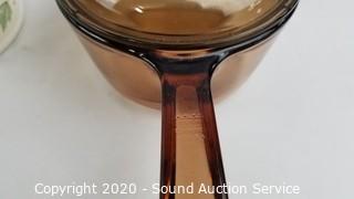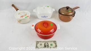 Item Description:  Includes 2 cast iron enameled Belgium  Descoware pots, Pyrex Corning Visions 1L pot  with lid and Corning ware Blue Cornflower  1.5qt roaster with lid.