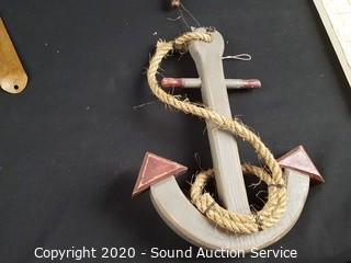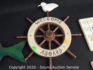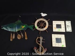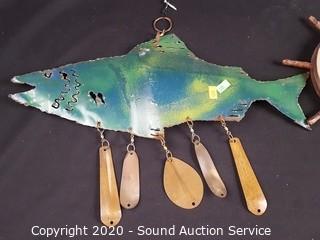 Item Description: Includes metal art fish and lure wind chime, ships wheel and anchor wood wall decor and 2 star fish and shell accent mirrors 6x6". Wind chime is 17" x 10".