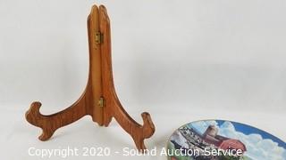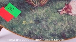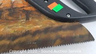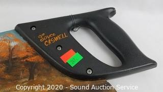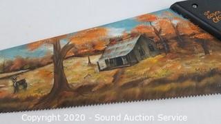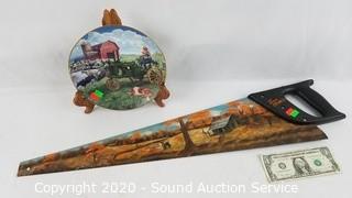 Item Description: Saw is signed "Mitchell" on the blade "Joyce Caswell" on the handle. Collector's plate is Danbury Mint titled "Days of Splendor", comes with stand.