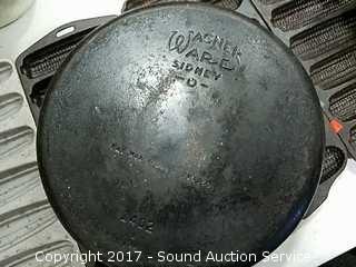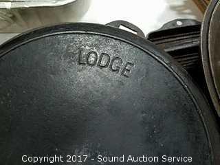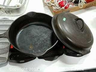Includes: Lodge skillet, Griswold lid #8, Wagner Ware pan.