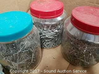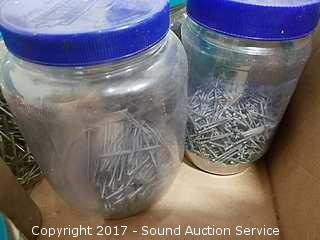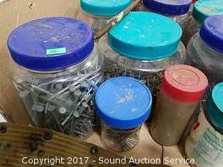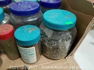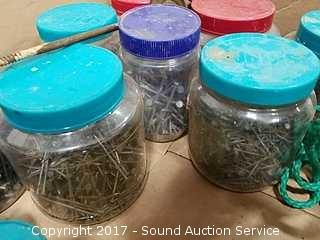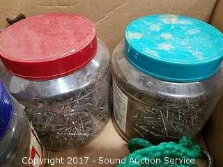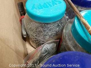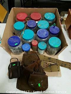 Includes: Peanut butter jar loaded full of various nails and leather tool belt.