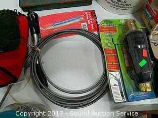 Includes: screws, nails, glue gun, plumber snake, drain king, scrapers, screwdrivers, duct tape, lock tight, nuts, and more.
