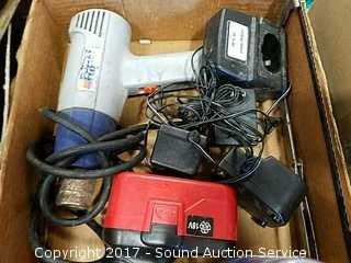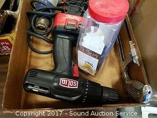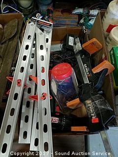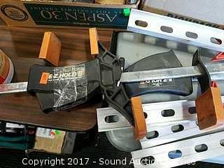 Includes: Jorgensen bar clamps, solid 18 volt drill, frame clamp, power pro paint stripper, hack saw and more.