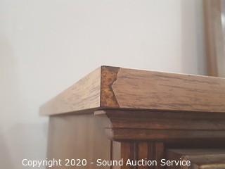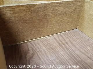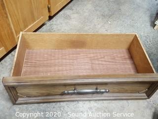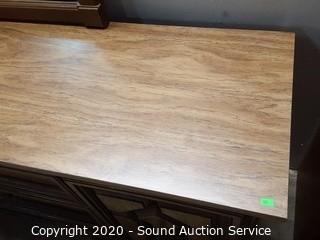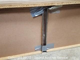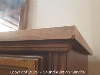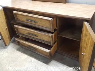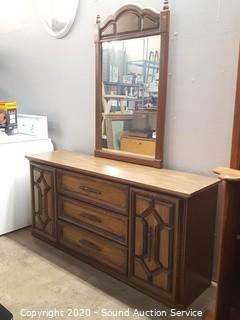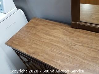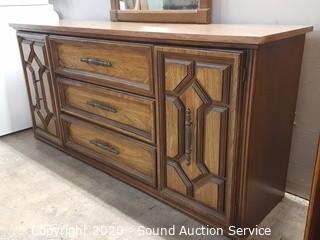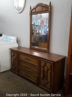 Item Description: 3 center drawers with 2 side cabinets, 1 of the top drawers guide is taped on and the bottom is falling out. 30.5" x 64.5" x 17" D with 46" x 28" mirror. Corners have a couple