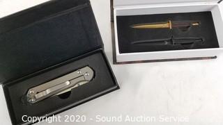 Item Description: Daggers are sharpened, 4" long, 2.25" blades. Chris Reeves is not authentic, blade is loose, very sharp, does not appear to have been used.