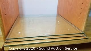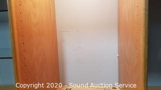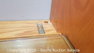 Description Cont. 1: tray on top shelf. Lights work and can be chained with the matching cabinets. Comes in 2 pieces for easier travel. 84" H x 48" W x 21" D. A few minor scuffs, scratches, otherwise great condition.