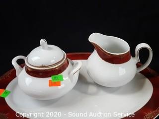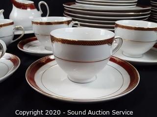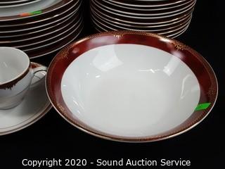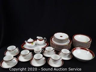 Item Description: Includes 8 dinner plates, 8 snack plates, 7 saucers, 12 bowls, cream, sugar, 8 cups, 9" serving bowl and 14" platter.