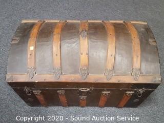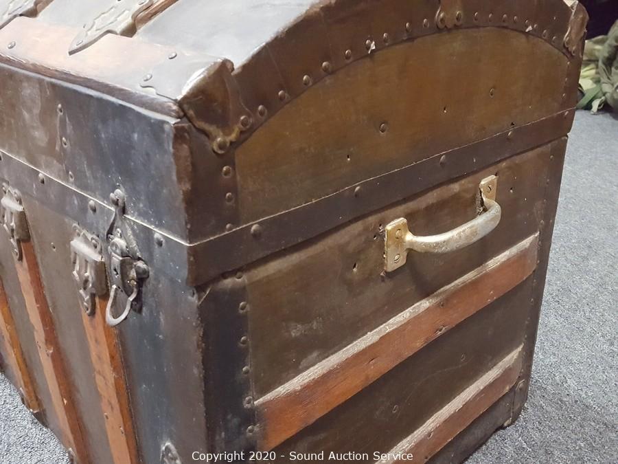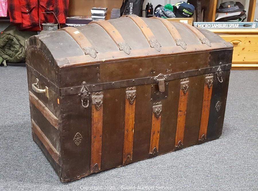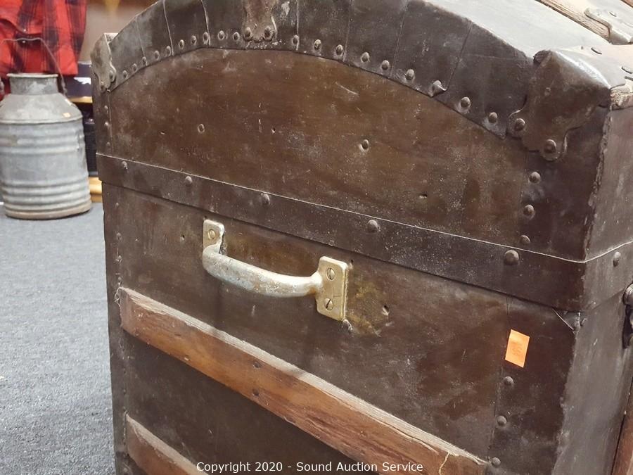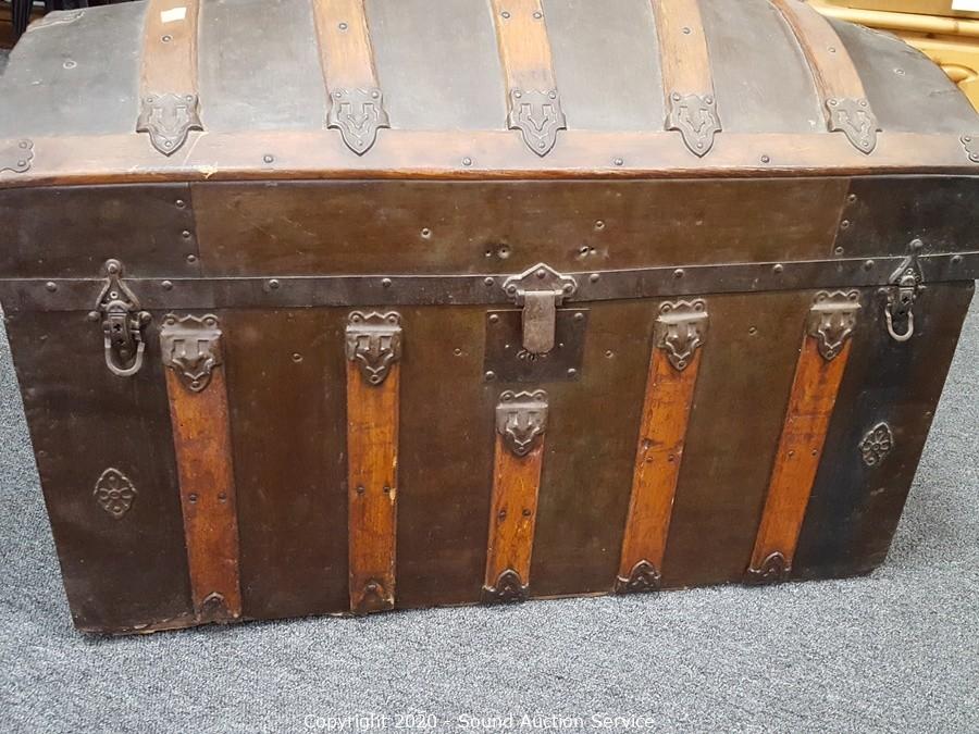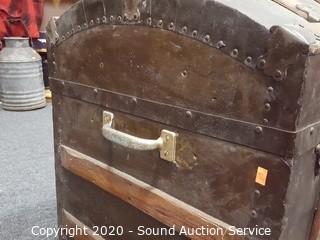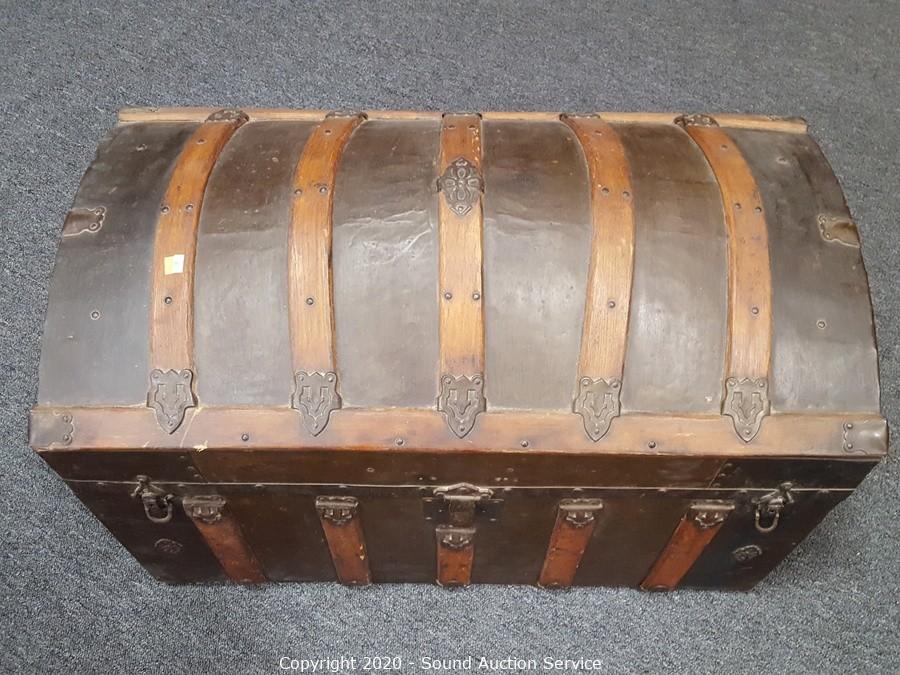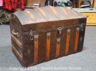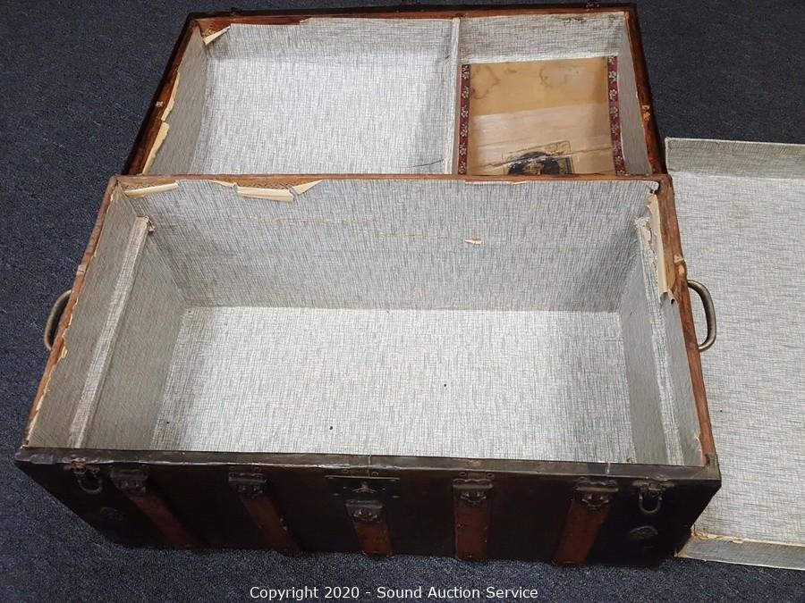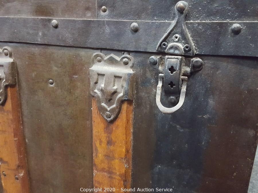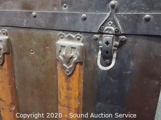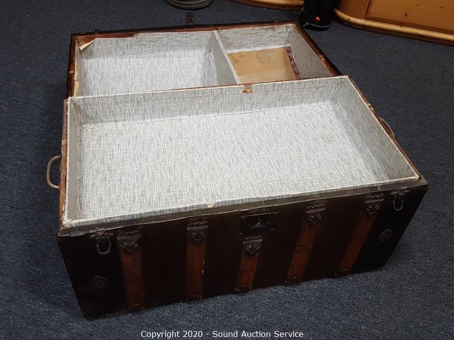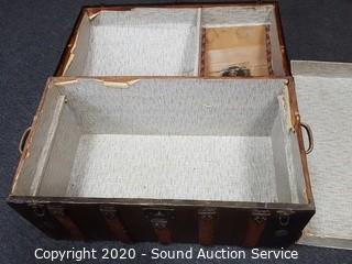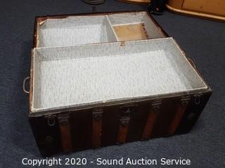 Item Description: In overall great condition, nice patina. Solid wood construction wrapped in metal with wood slat accents. Newer metal handles have been added to the sides. Has the tray insert.