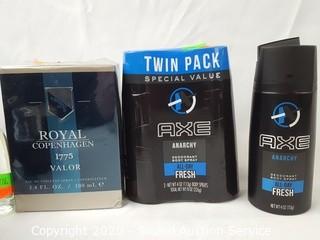 Item Description: Includes 2 bottles of Sean John's "Unforgivable" cologne, Old Spice Swagger body spray, Axe Anarchy body spray, Izod cologne and body spray, Playboy Vegas cologne