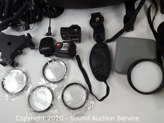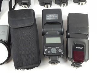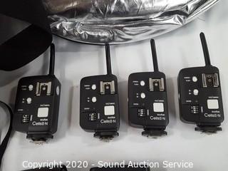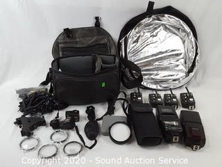 Item Description: Includes Neewer reflector and flash speed light 750ii and speed light TT560, 4 Godox Cells II-N, wireless flash systems (contains 4 remotes and 3 receivers), lens filters,