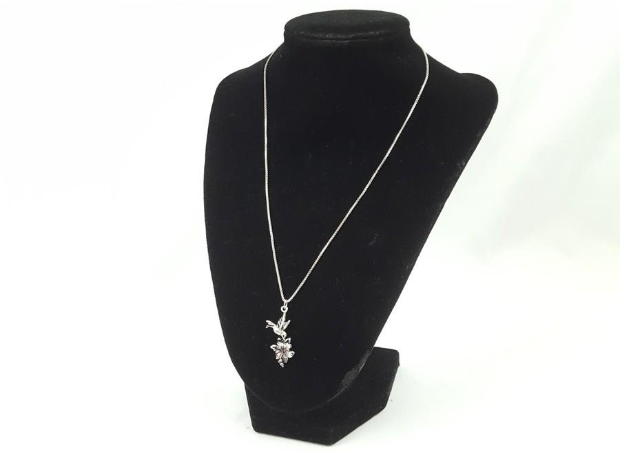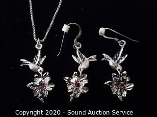 Lot #0020: Sterling & Ruby Hummingbird Necklace &Earrings Set