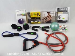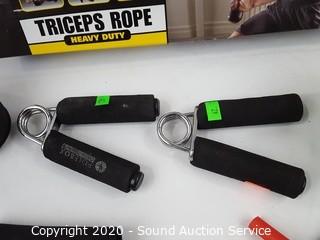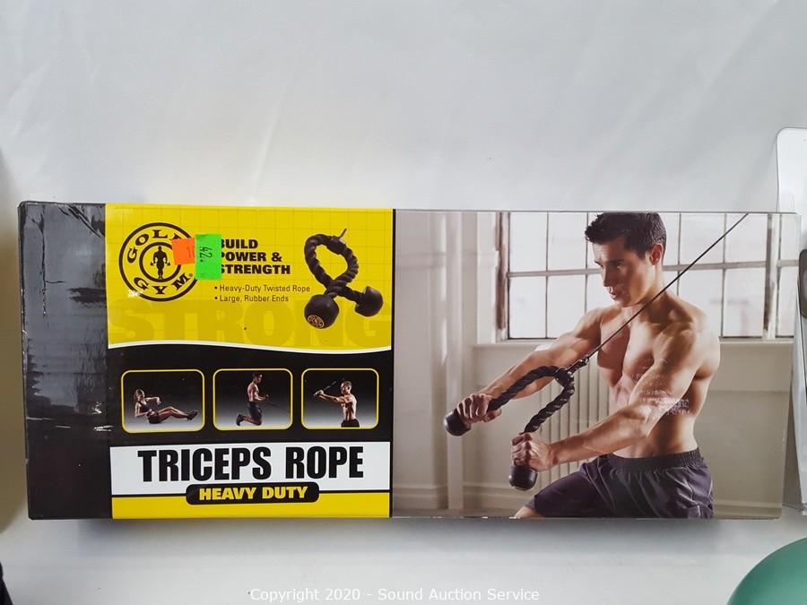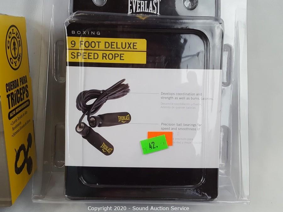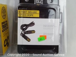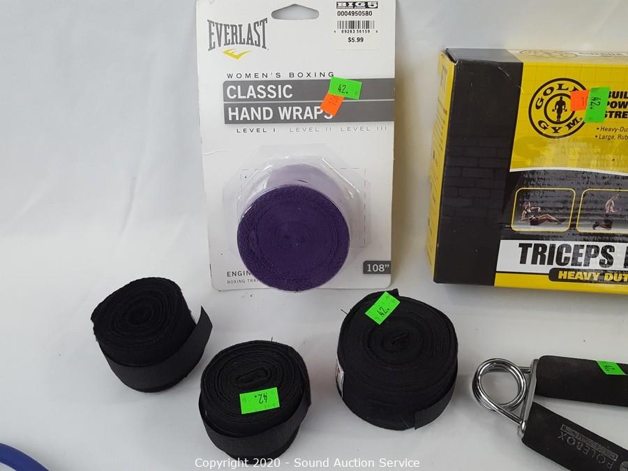 Item Description: Includes resistance bands, hand strength trainers, Miracle Ball with booklet, wrist wraps, classic boxing hand wrap, Gold Gym triceps rope and 9ft deluxe speed rope.