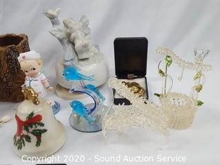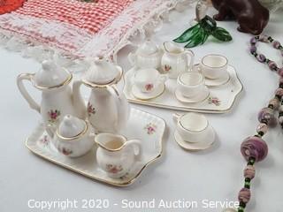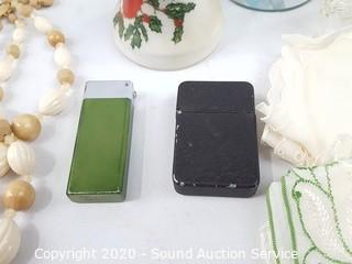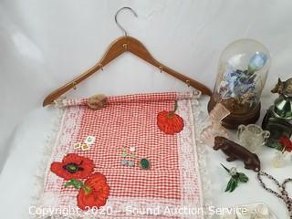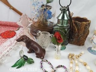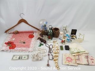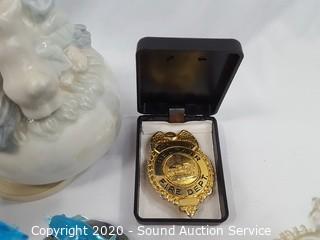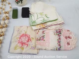 Item Description: Embroidered handkerchiefs, art glass trinkets, compass, Fire Dept. badge, Zippo style lighter, miniature porcelain tea sets and more.