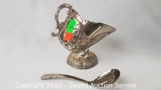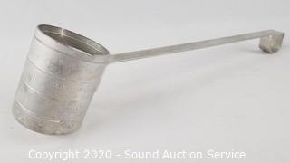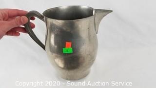 Item Description: 11 aluminum coasters, pewter cream and sugar, aluminum ladle, pewter pitcher, aluminum tray and silver plate creamer.