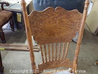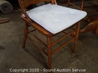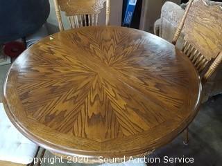 Item Description: Comes with 4 chairs, each chair has a carved back & chair pads. Stunning grain structure in the top of the table. In excellent condition. 29" H x 44" Dia.