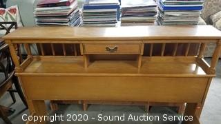 Item Description: Complete with headboard, footboard, rails, slats. Headboard has a single drawer and shelf. 40" H x 59" W x 10" D headboard. 17" H footboard.