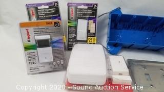 Item Description: 2 GFCI outlets, motion sensor wall switches, timer switch, stem mount photocell, LED step light and PVC electrical outlet boxes (32, 18, 14 and 60 cu. in.)
