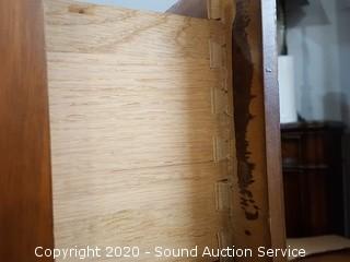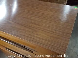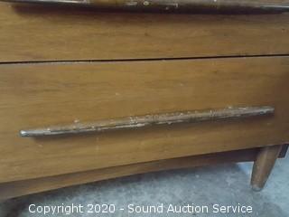 Item Description: Dovetail construction, laminate top. Some wear to the finish, one drawer is missing handle, and center drawer has been modified to set in, giving it a unique look. 43" H x