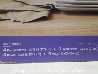 Item Description: Includes 4 dinner plates, 4 bowls, 4 salad plates and 4 mugs.