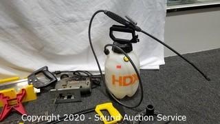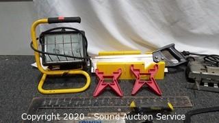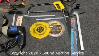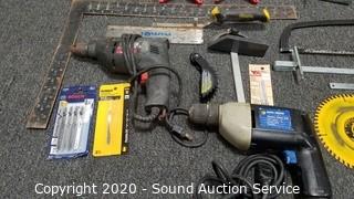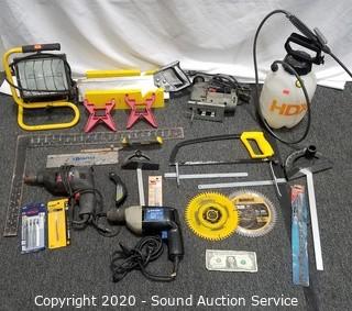 Item Description: Elec. drills, jig saw, halogen work light, hacksaw, miter saw w/box, sprayer, carpenters square, table saw push guides. Unknown condition.