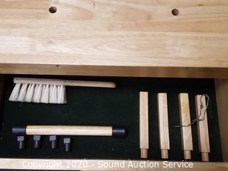 Item Description: In excellent condition. Form hole pegs, built in vise, 4-drawers, lower storage. 34" H x 60" W x 20" D. some minor wear to the top.
