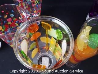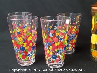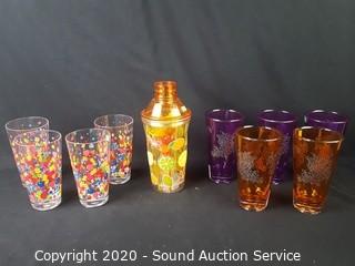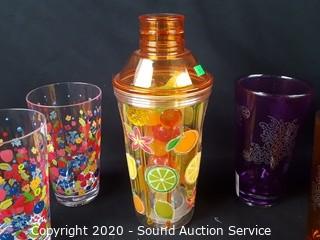 Item Description: Shaker comes with fruit shaped ice packs, that go in the middle to keep drinks cold. 4 Glasses are fruit print, 3 Purple print & 2 orange print 20oz cooler glasses.