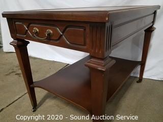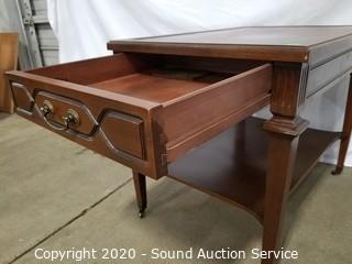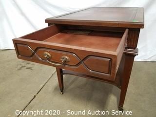 Item Description: Some crazing in the leather. Brass Casters, single drawer, matches coffee table in next lot. 22" H x 20" W x 28" D.