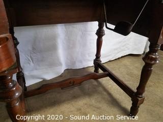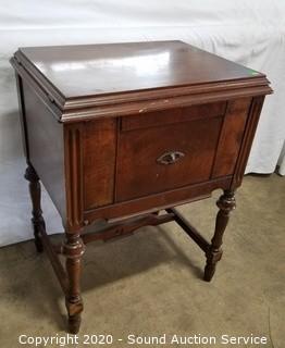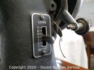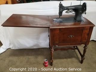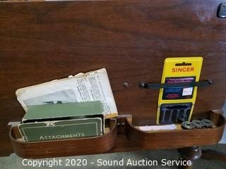 Item Description: Serial 47X10469. Has duck tape on the engine and wheel for grip. Has a knee lever, comes with bobbins, needles, partial manual and attachments. Cabinet is solid mahogany, in