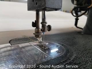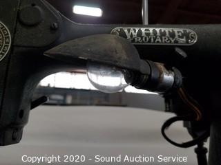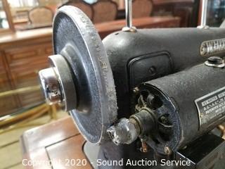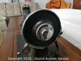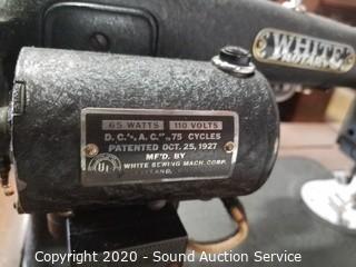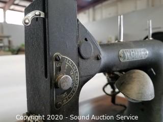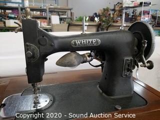 Lot #0019: Vtg. White Elec. Sewing Machine w/Cabinet