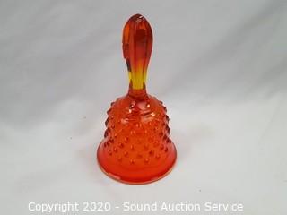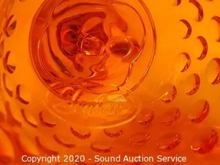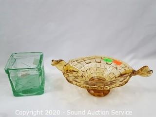 Item Description: Includes Fenton Amberina bell, 3 uranium glass bowls, slag glass votive, Anchor Hawking yellow cameo tea cup, Frigidaire satin green vase (has a crack), marigold,