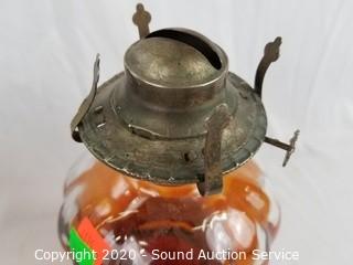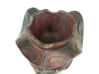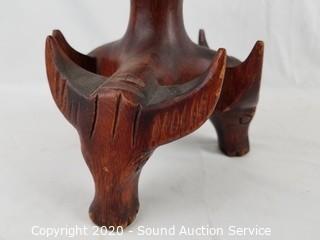 Item Description: Oil lamp is missing the chimney, hand carved art piece has image of bulls, possibly designed to hold cigars or pipes, 13.5" x 6.5" dia.