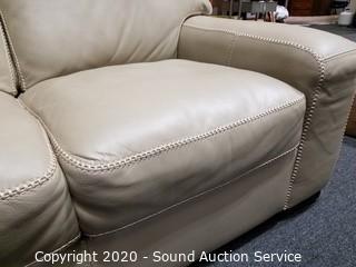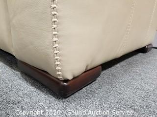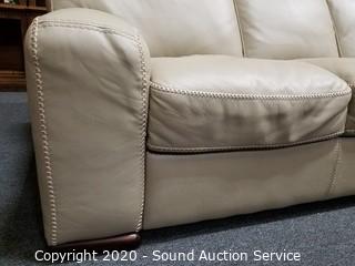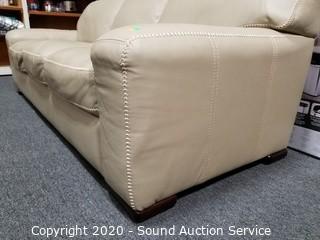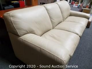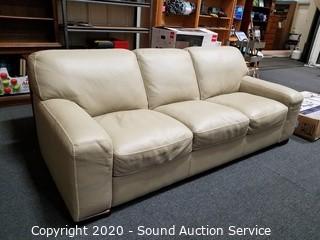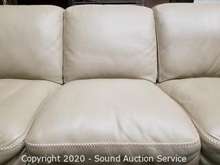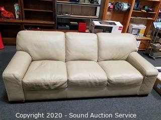 Item Description: Beige with heavy accent stitching. The leather is very soft like Cabretta leather. 34" H x 90" W x 40" D x 18" to seat.