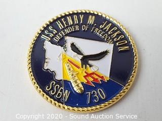 Item Description: Includes Naval Undersea Warfare Engineering Station steel sign and submarine plaque, USS Henry M. Jackson "Defender of Freedom" challenge coin. Steel sign is 15" diameter,