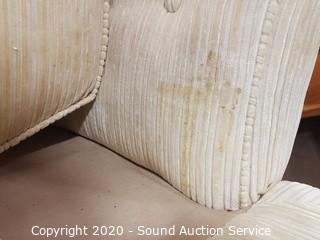 Item Description: Cream color (has a small stain on the right inside arm, may wash out). Comes with contrasting throw pillow. 30" H x 28" W x 18" to seat.