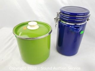 Item Description: McCoy Includes tea pot, cream, sugar, salt, pepper and butter dish. Also comes with cobalt and green enameled canisters.