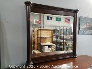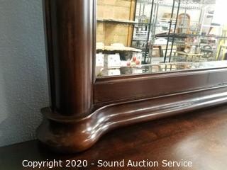 Item Description: In excellent condition. 42.5" H x 64.5" W x 19" D with a 38" H x 40" W beveled glass mirror. Matches the next lot.