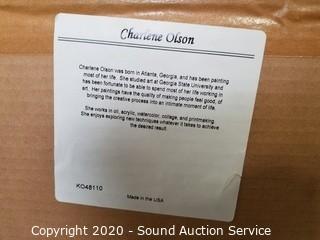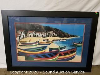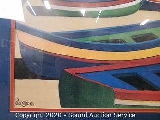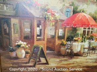 Item Description: Kim Parker floral Giclee, 22" x 18". Charlene Olson, Seaside Shops Giclee, 16" x 16". Peorge Signed Original? Oil on canvas Seaside Boat painting, 31" x 45". And Giclee Cafe