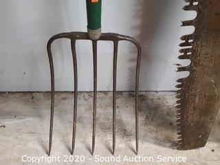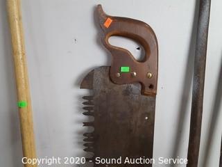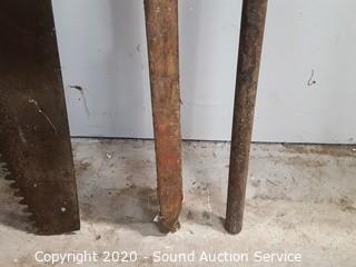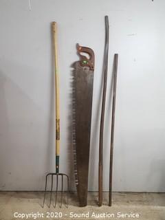 Lot #0033: Vtg. 5'ft Crosscut Saw, 2 Digging Bars & Pitchfork