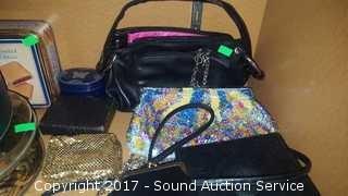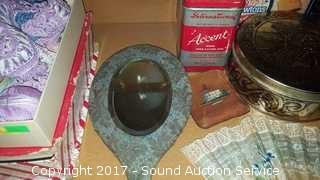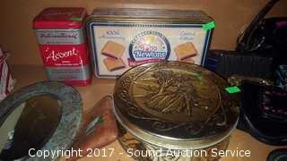 Lot #0202: Vtg. Sewing Tins Purses Mirror Linens & More
