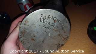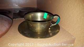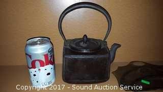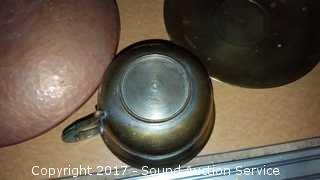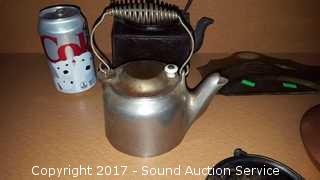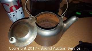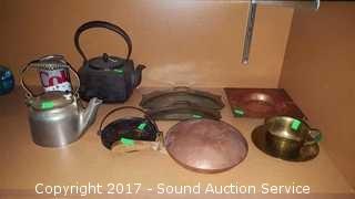 Includes: Cast iron teapot and trivet, Wagner Ware Sidney aluminum teapot, copper table sweeper pan, brass table dust pans, brass teapot, and more.
