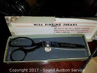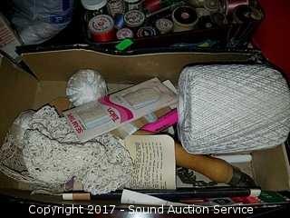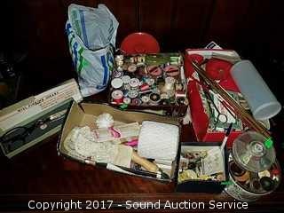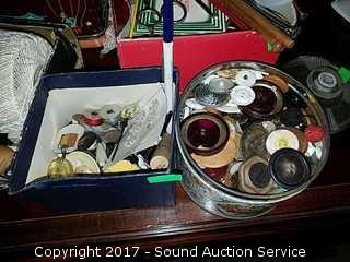 Includes: Buttons, bobbins, thread with wooden spools, crochet needles, Wiss pinking shears with box, and more
