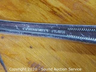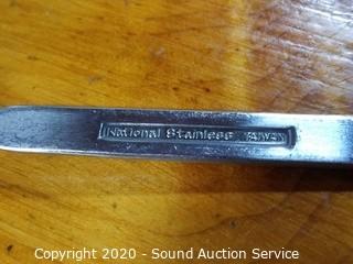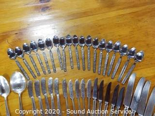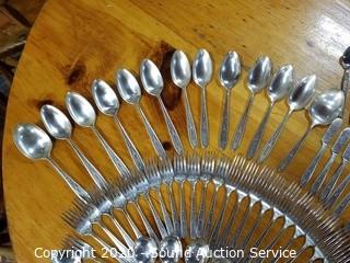 Lot Details: Silverplate and stainless. Community includes 9 soup spoons, 13 small forks, 11 medium forks, 10 large forks, 11 large spoons, 3 serving spoons, 12 butter knives, 5 steak knives, 12 spreaders (2 types), sugar cube tongs. National includes 19 spoons.